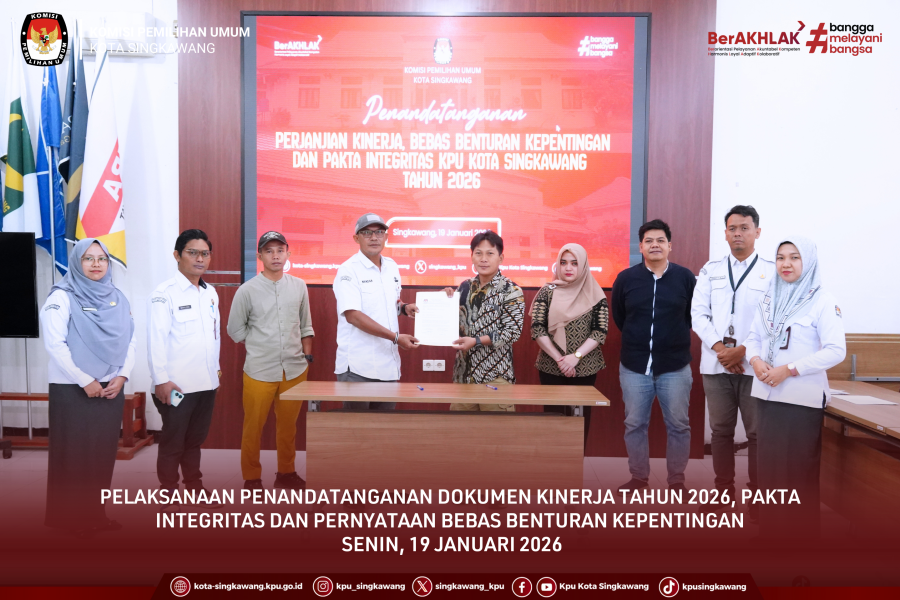 #TemanPemilih, Komisi Pemilihan Umum Kota Singkawang melaksanakan Penandatanganan Dokumen Kinerja Tahun 2026, Pakta Integritas, serta Pernyataan Bebas Benturan Kepentingan sebagai bagian dari penguatan tata kelola organisasi di awal Tahun 2026, Senin (19/01/2026). Kegiatan yang dilaksanakan di Aula Kantor KPU Singkawang ini menjadi langkah strategis untuk memastikan seluruh pelaksanaan tugas dan fungsi kelembagaan berjalan sesuai prinsip profesionalitas, transparansi, dan akuntabilitas.